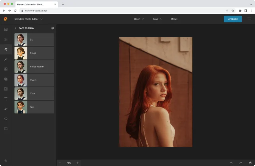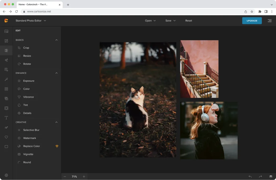 The web app at edit.cartoonize.net loads straight into the editor with no sign-up required for Basic. It offers one-click cartoonizer/painting/sketch effects alongside layers, text & masks, overlays, frames, collage, exposure & color controls , and compress/convert (JPG, PNG, PDF) — with export up to 400 DPI for print.