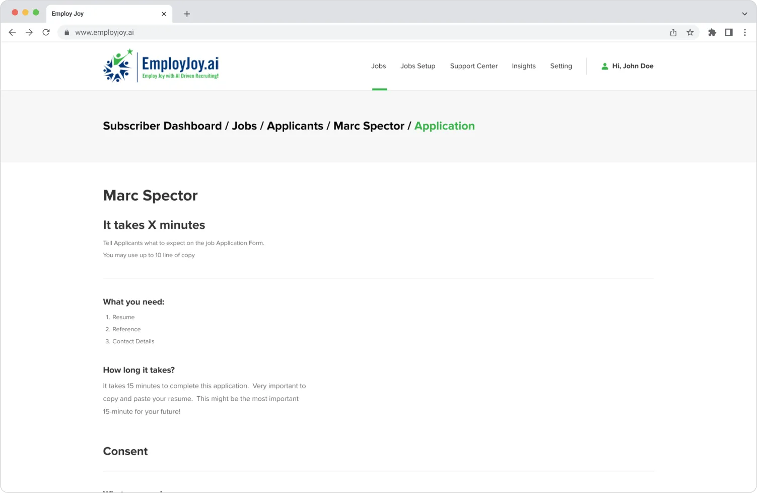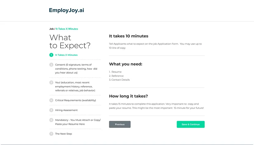 We supported brand and plan language consistent with EmployJoy’s mission and ensured the site/app copy harmonizes with the EMPLOYJOY.AI trademark scope (AI for evaluating applicants).